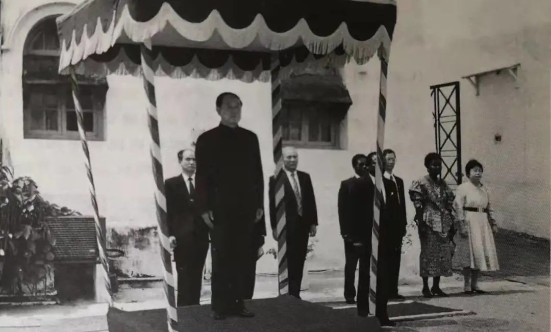△ 1991年9月,郭靖安大使遞交國書時檢閲儀仗隊。後排從右至左依次為:作者、加納女禮賓官、我政務參贊、商務參贊、“城堡“典禮局長、加納外交部禮賓司長和我經濟參贊。圖源:《出使非洲的歲月》