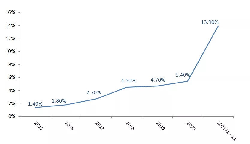 圖1:2015-2021/1-11我國新能源車零售滲透率(單位:%),資料來源:乘聯會,中國汽車工業協會