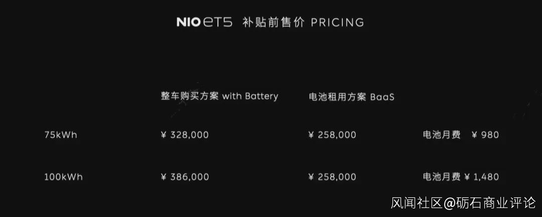 2021年12月18日,在2021蔚來日(NIO Day 2021)上,蔚來正式發佈中型智能電動轎跑ET5,起售價為32.8萬元,頂配版為38.6萬元。如果採用蔚來的租賃電池方案,ET5起售價可以降低到25.8萬元,電池月費為980元/月、1480元/月。ET5預計將於2022年9月開啓交付。