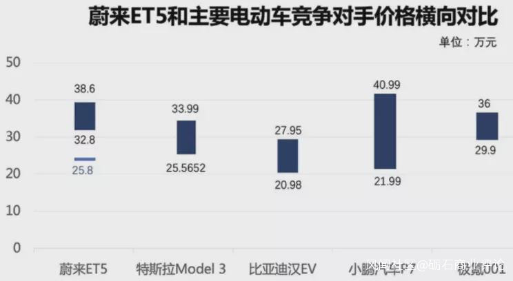 與備受矚目的ET7相比,蔚來ET5車型、軟硬件配置都較為相近,最大的優勢在於價格。不過,儘管相較ET7便宜了12萬元,ET5與Model 3、比亞迪漢、小鵬P7、極氪001等同類競品相比,起售價卻是最高的。