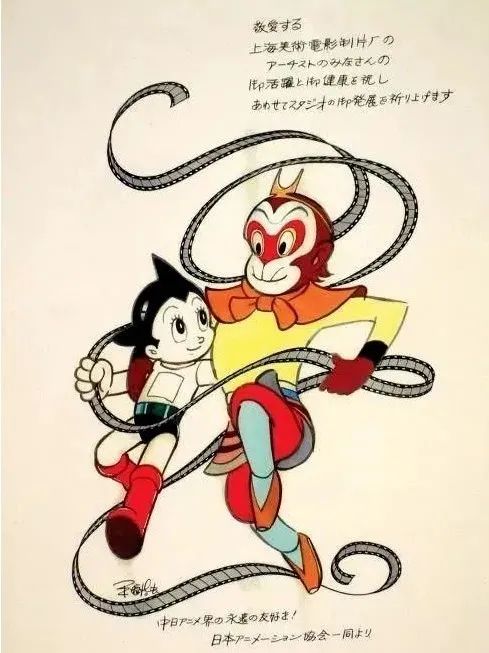 都説藝術無國界,民族的就是世界的。誰能想到日本動漫大拿手冢治虫也是咱們大聖的死忠粉。不僅追角色,還要追真人,來到中國見到了影片的主創,手冢大神激動地像參加偶像握手會,並附贈了自己的同人大作,“孫悟空親切會見阿童木,兩人就相關問題達成共識,併成為勾肩搭背的鐵哥們”。