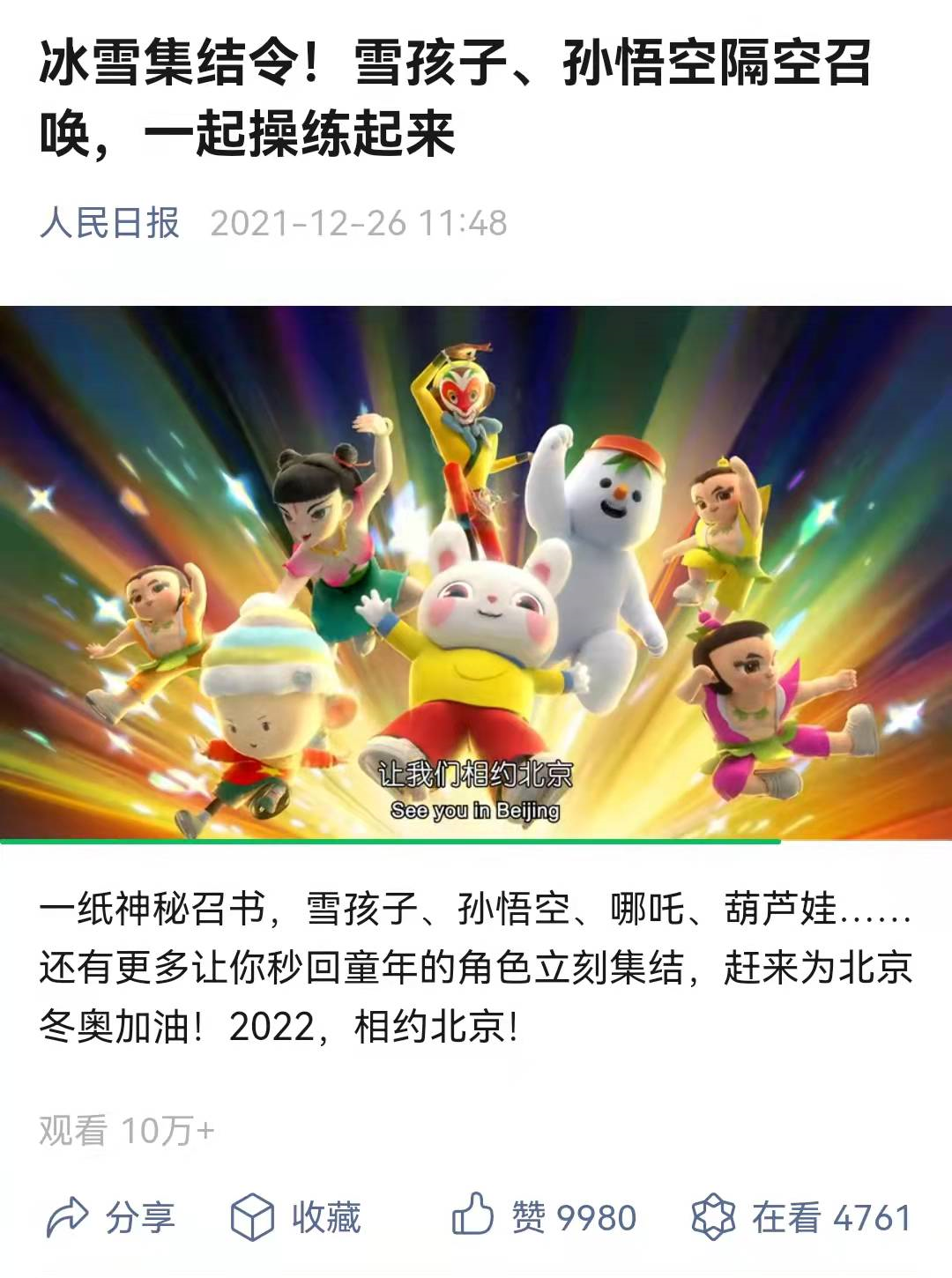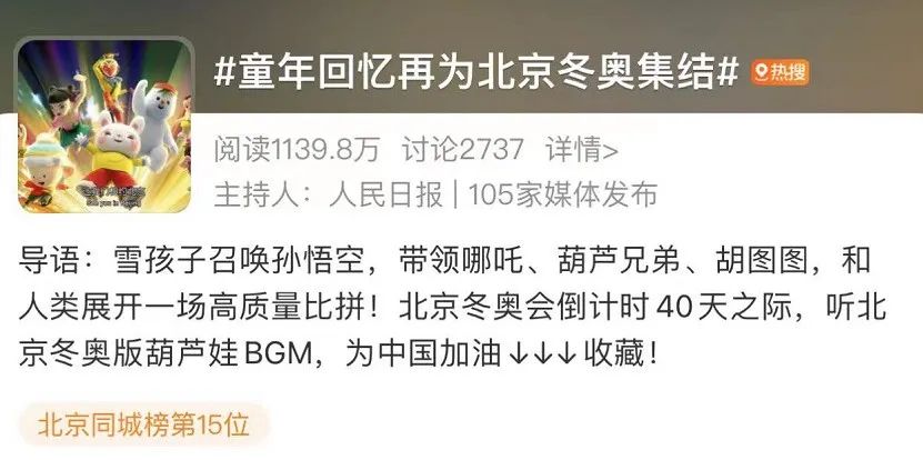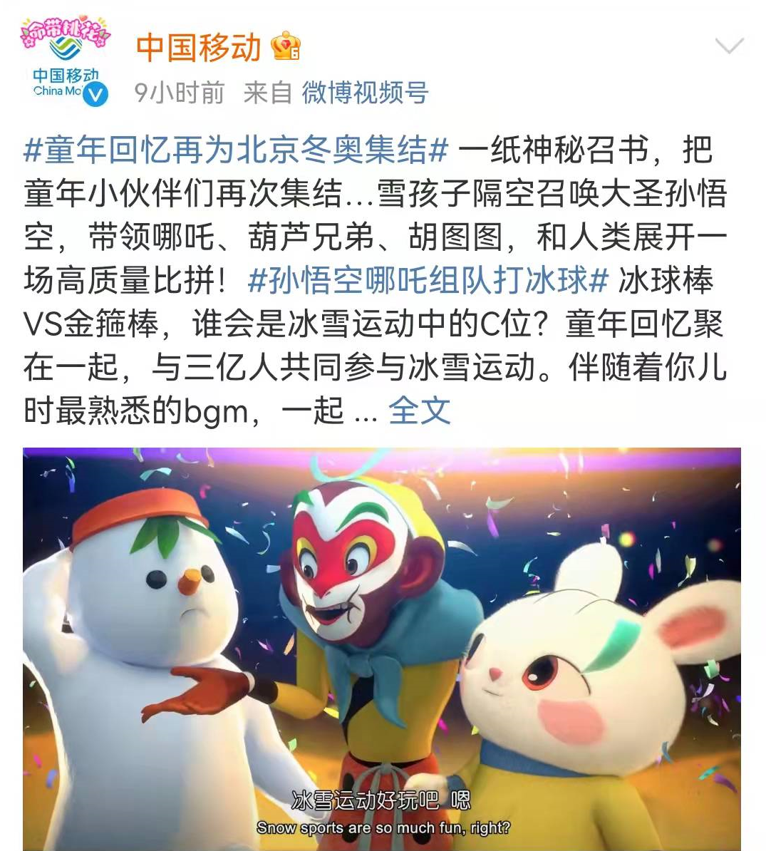 #童年回憶再為北京冬奧季集結#、#孫悟空哪吒組隊打冰球#,熱搜視頻裏出現了多個承載國人童年回憶的經典動畫角色,雪孩子、孫悟空、葫蘆娃、哪吒等等,結尾的冬奧會版《葫蘆娃》主題曲,更是BGM一響,觸動許多人的DNA,留下動情評論: