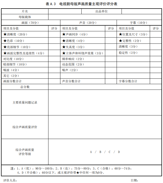 《規範》對電視劇的畫面、聲音、字幕均有明確規範,這樣至少確保了電視劇在製作質量和觀感上能夠達標,並由7~15人組成的主觀評價員進行打分和等級劃分。