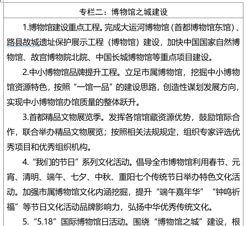 而在《北京市“十四五”時期文物博物館事業發展規劃》中,博物館之城建設已經細化為一個重要的專欄,列出了八項重要舉措。