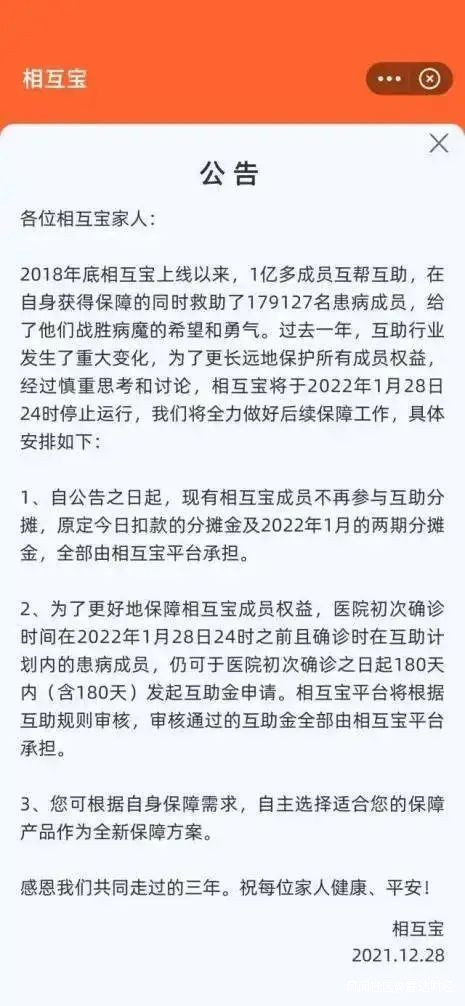 相互寶12月28日公告顯示,互助計劃將於2022年1月28日停止運行。公告之日起,成員不再參與互助分攤。原定於公告日扣款的分攤金及2022年1月的兩期分攤金,全部由相互寶平台承擔。