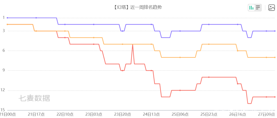 據七麥數據顯示,從16號上線到12月26日為止,《幻塔》在iOS角色扮演類遊戲排行中,僅次於《原神》排名第三,免費遊戲總榜中從初始的第10名回落到第13名,榜單曲線維持在一個非常堅挺的水平。
