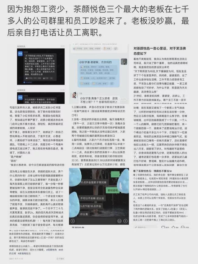12月17日,營銷號曝光茶顏悦色大老闆親自下場和員工吵架,起因是發工資後很多人抱怨工資太少,基本上都是一千多、兩千多,“人均工時11小時,時薪6-9元”。
