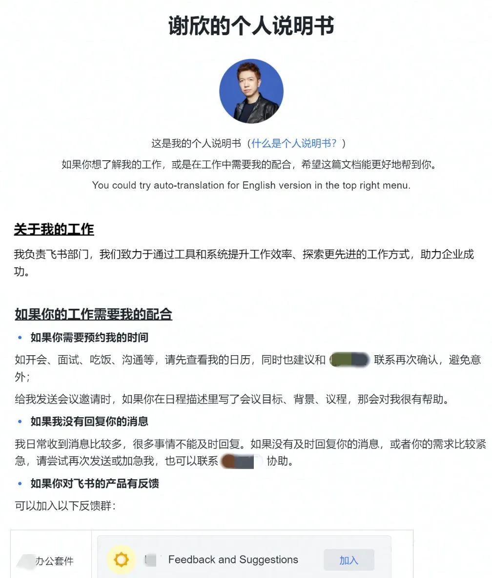 謝欣介紹過一個叫做**“個人説明書”**的內部實踐,它是一個掛在簽名檔上的飛書文檔鏈接,介紹自己的職責、如何與自己溝通和配合、能夠提供的幫助等話題。
