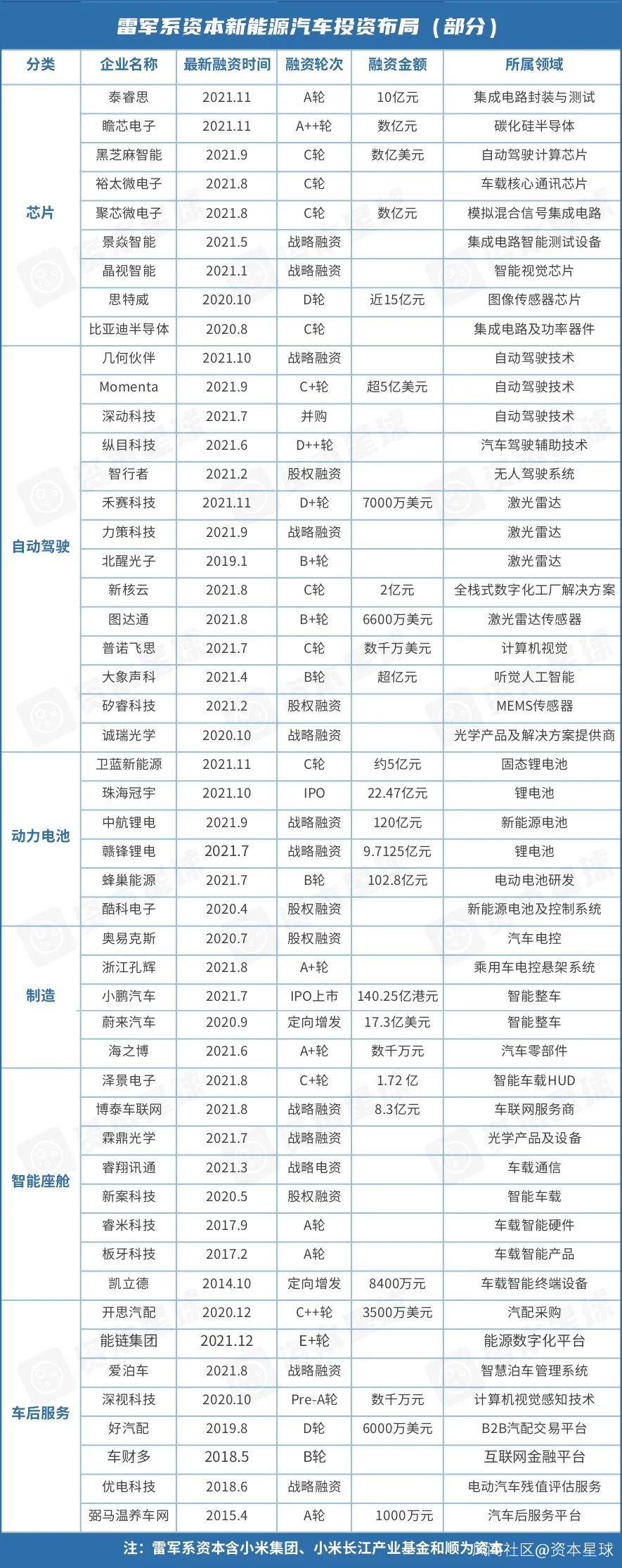 “三電”是新能源汽車區別傳統燃油車最核心的部分,智能電動也是小米持續關注的重點,投資的企業超過10家。包括中航鋰電、蜂巢能源、贛鋒鋰電等企業背後都有小米的身影。其中中航鋰電與蜂巢能源是2021年上半年動力電池裝車量前十名,二者合計佔國內動力電池裝車量的8.5%。更早前,小米還入股了消費類電池供應商珠海冠宇。