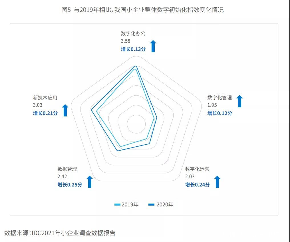 根據11月IDC發佈的《2021中國中小企業數字化初始指數白皮書》數據顯示,中小企業尤其是製造業企業相對於2019年,數字化認知指數最高的是數字化辦公,其次是對新技術的利用。