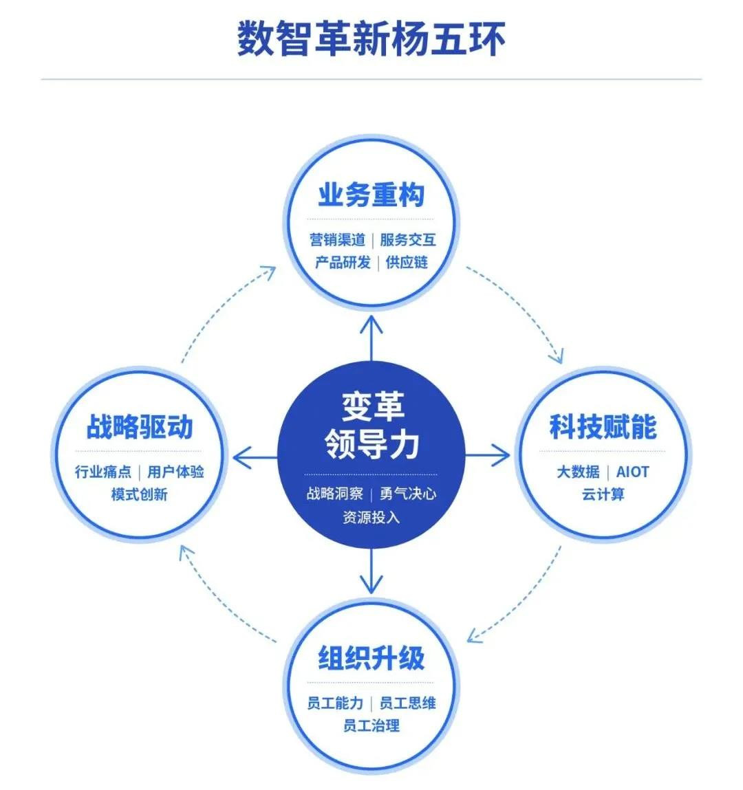 “數智革新楊五環”理論框架和路線圖,**包括戰略驅動、業務重構、科技賦能、組織升級、變革領導力五大環節,**層層遞進又首尾相連,為企業實現數智化轉型升級提供了參照框架。