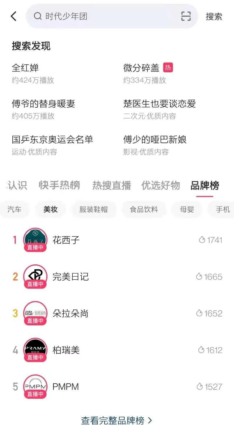 其中,公域流量的切割源自搜索場景。今年10月22日,快手搜索中品牌熱榜上線,平台根據品牌的搜索、播放、互動等數據計算品牌熱度,並在搜索頁面下提供每週更新的品牌熱度榜。點擊品牌頭像後,根據品牌開啓自播與否,用户分別會被導向品牌賬號主頁和品牌直播間。
