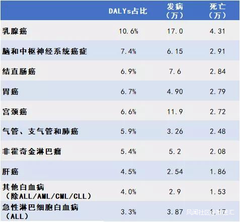 其中,2019年DALYs負擔佔比最高的10類癌症分別是:乳腺癌(10.6%)、腦和中樞神經系統癌症(7.4%)、結直腸癌(7.0%)、胃癌(6.7%)、宮頸癌(6.6%)、氣管、支氣管和肺癌(5.9%)、非霍奇金淋巴瘤(5.4%)、肝癌(4.5%)、其他白血病(除ALL/AML/CML/CLL四大類,4.0%)、急性淋巴細胞白血病(ALL,3.3%)。
