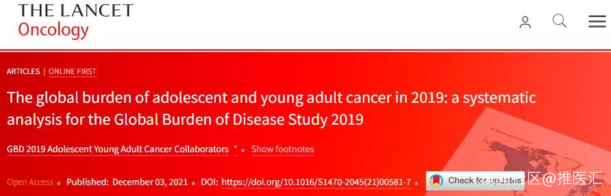[1] GBD 2019 Adolescent Young Adult Cancer Collaborators. The global burden of adolescent and young adult cancer in 2019: a systematic analysis for the Global Burden of Disease Study 2019. The Lancet Oncology, DOI: https://doi.org/10.1016/S1470-2045(21)00581-7