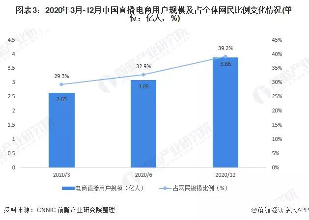 此外據《電商報》報道,今年雙十一淘寶近8成的成交額是通過直播貢獻。2021年2月,CNNIC發佈《第45次中國互聯網絡發展狀況統計報告》數據顯示,截至2020年12月,我國直播電商用户規模達3.88億人,佔網民整體的39.2%。