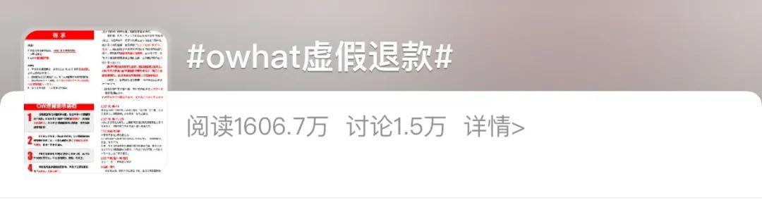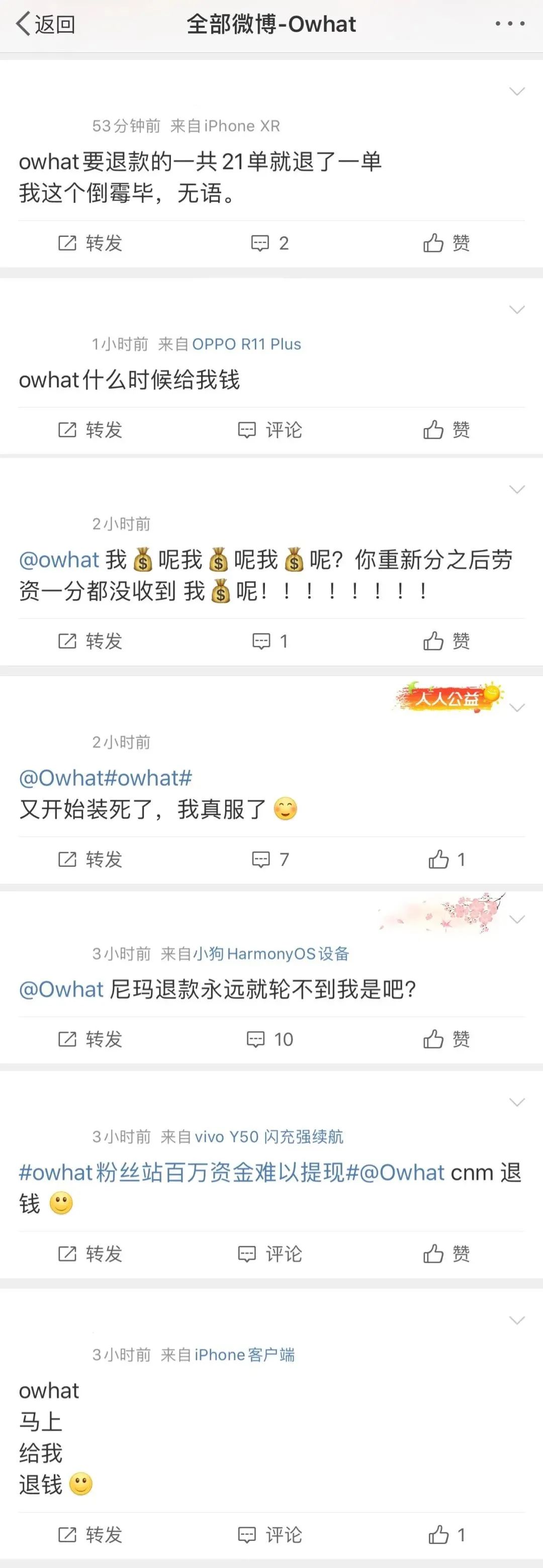 還有粉絲髮微博稱,自己的區號明明在官方進度之前,卻並沒有收到退款,#Owhat虛假退款#這一詞條也被憤怒的粉絲們刷上了千萬閲讀。