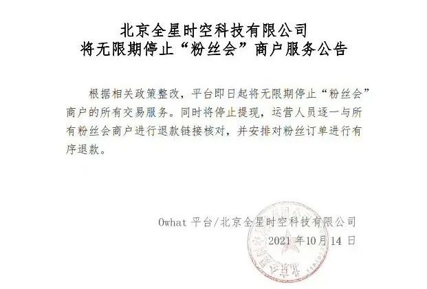 10月14日,Owhat發佈公告,稱將無限期停止所有粉絲站的交易和提款活動,剩餘款項將退還給粉絲。