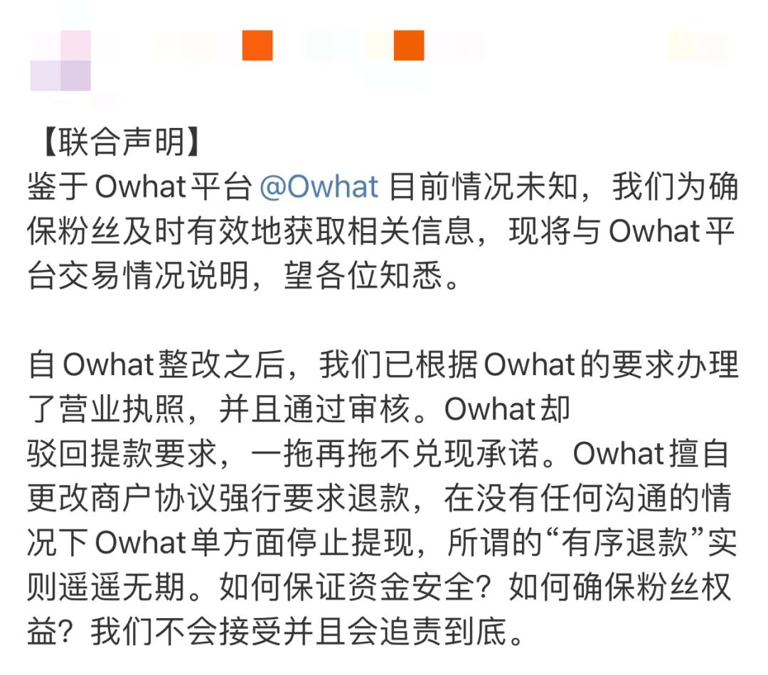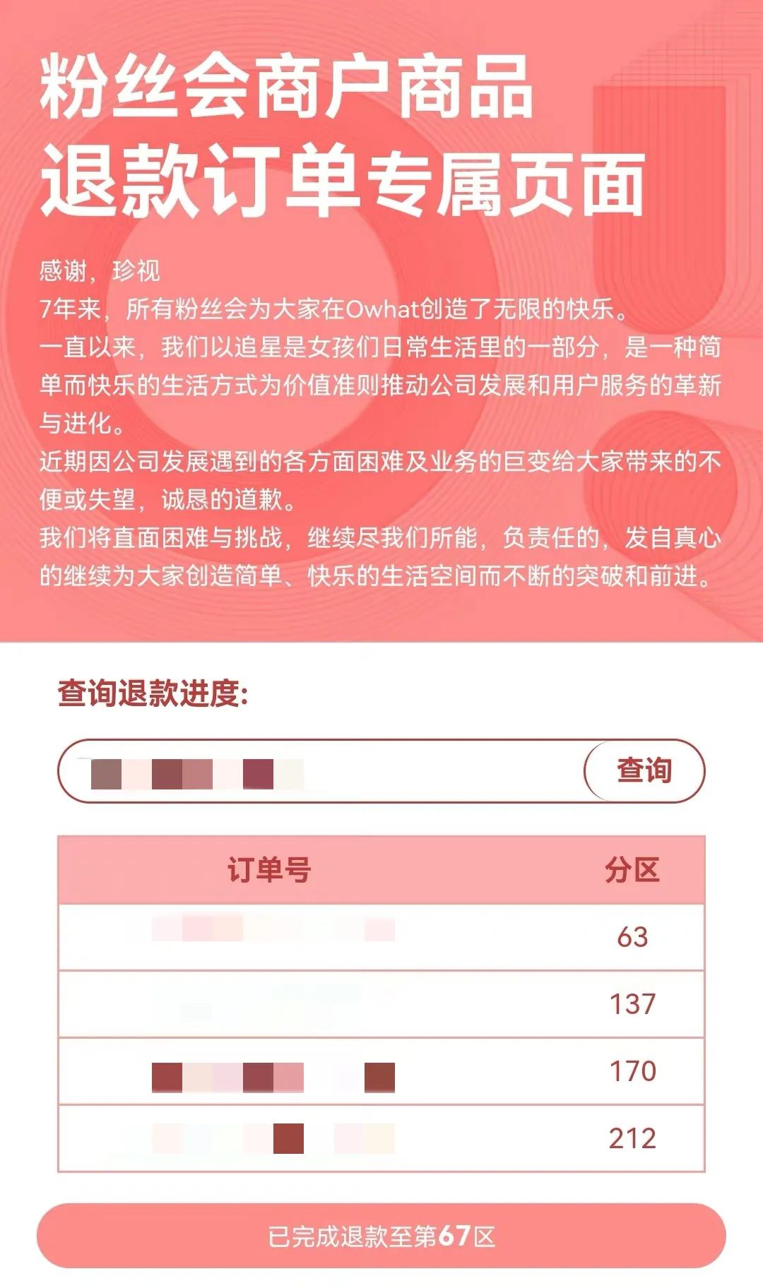 聲勢浩大的“討錢”浪潮來自於今年10月14日Owhat發佈的公告。在長達近半年的提款困難後,Owhat發佈了“停止一切銷售活動,並將全部貨款退還給粉絲”的公告,但從如今的運作看來,這只是一張空頭支票。