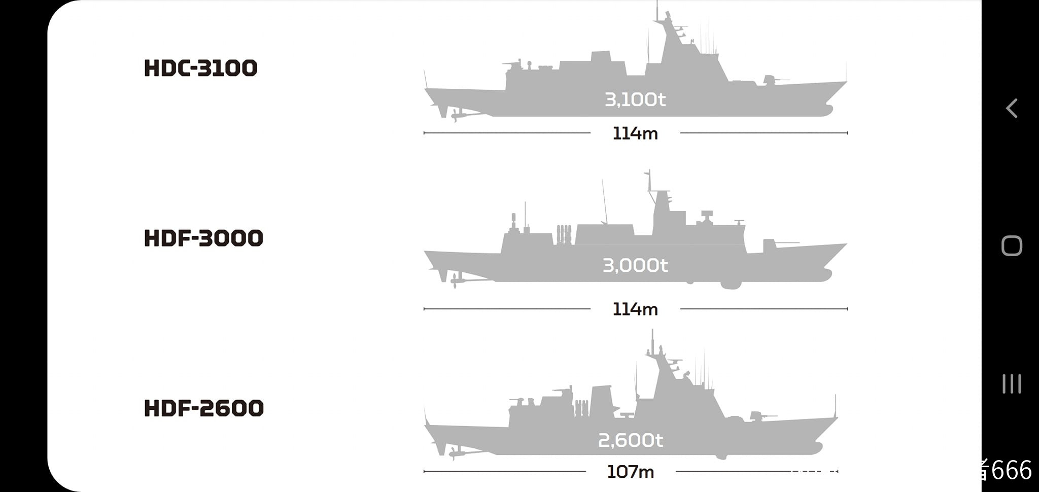 船舶出口項目對比圖 韓國現代重工(HHI) :HDC-3100項目的護衞艦和HDF-2600和HDF-3000項目的護衞艦(c)現代重工