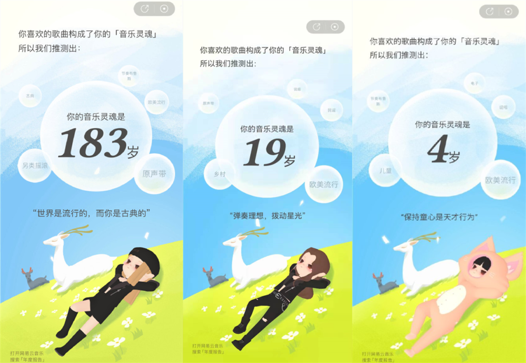 目前,在數據維度上,較為單一。以音樂類為例,一致指向註冊時長、聽歌數量、單曲循環最多次、曲風類型、最愛的歌手、特殊時刻(最早或最晚)等。社交類APP,分享頁無論是微博、滴滴的年度人設,高德地圖的年度形象,還是百度的搜索人格,都指向人物個性標籤。