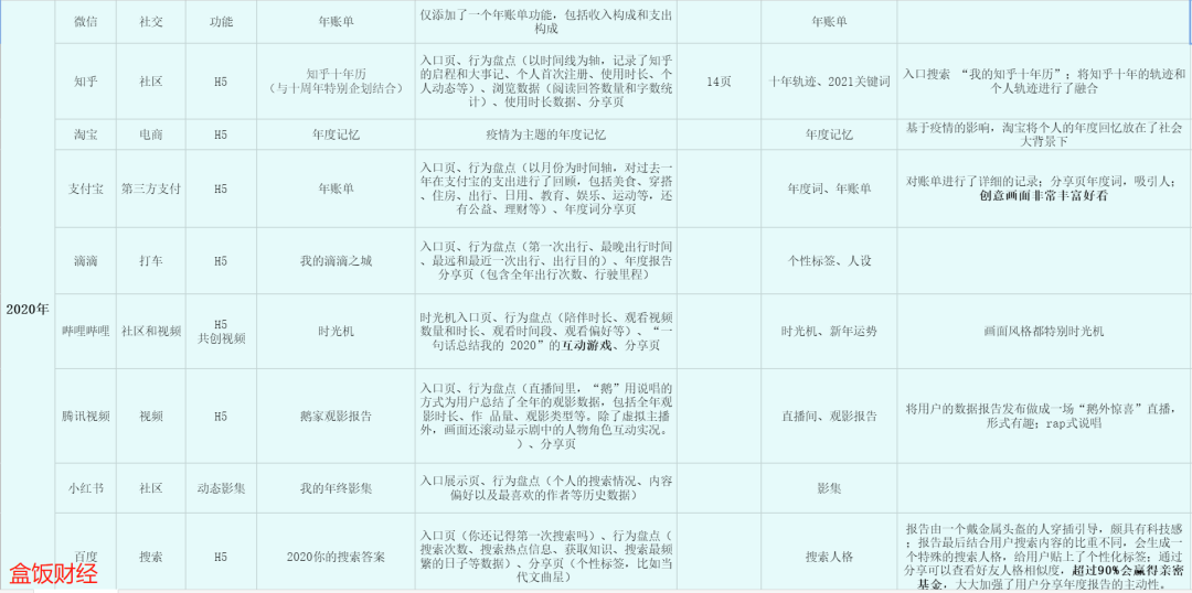 內容框架,盒飯財經分析後認為,至少要包含三個部分,即入口展示頁、行為盤點和生成個人專屬年度報告。當然根據平台屬性不同,可以增加不同的內容,如音樂類一定會總結年度歌單、年度最愛歌手等。