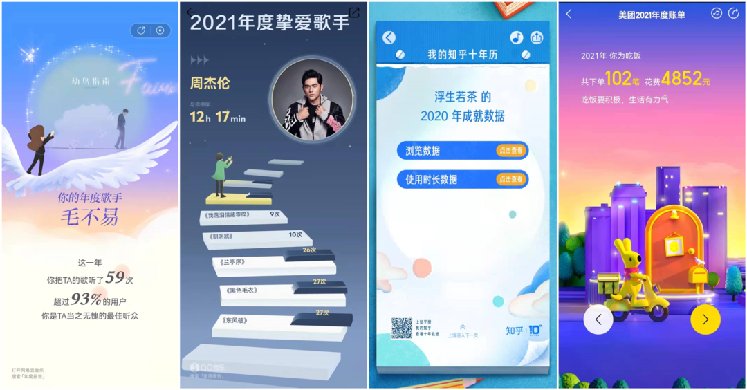 在去年,豆瓣、知乎、支付寶、淘寶、QQ音樂、微信讀書、滴滴、百度、美團、高德、B站、今日頭條、微博等,至少有30+家的APP推出過年度報告。
