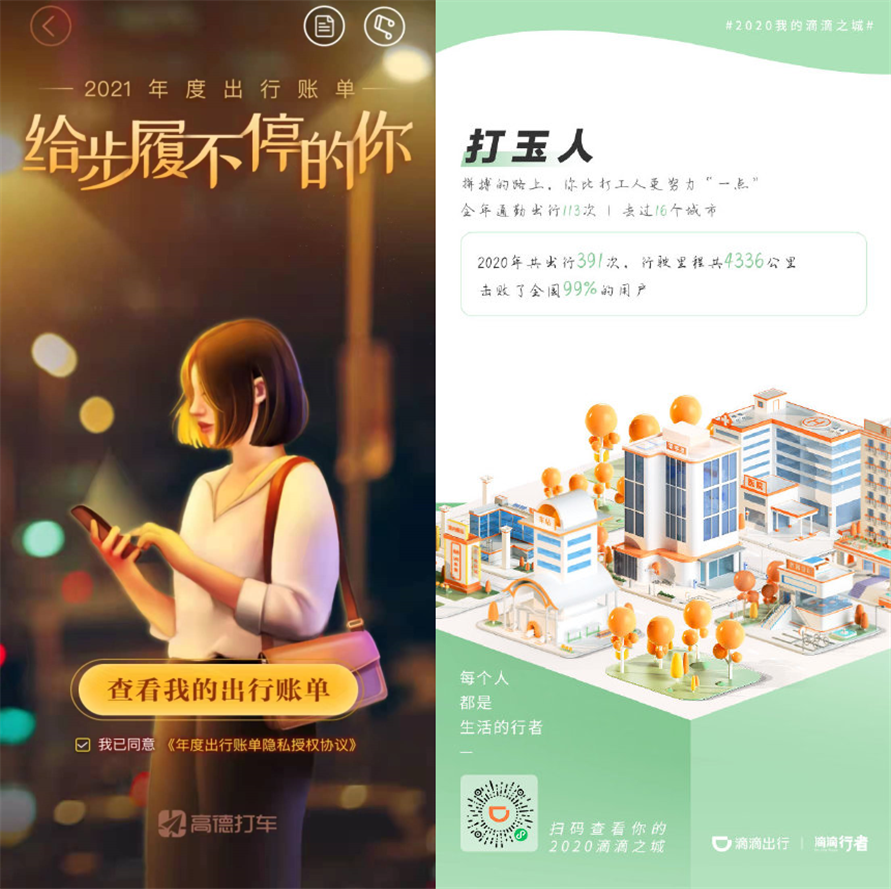 高德打車和滴滴,一個側重年度賬單和個人專屬出行形象(城市穿梭人,你是奔走族也是生活派),一個側重“我的滴滴之城”,在哪些城市留下了你的足跡。