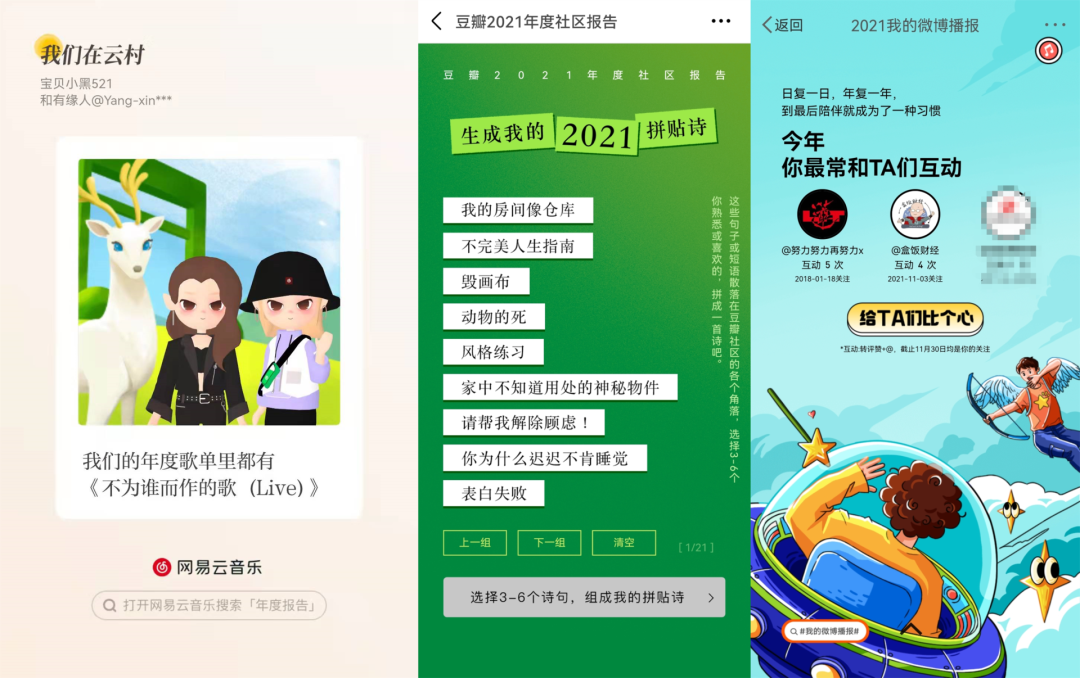 行為盤點涵蓋的內容則較為複雜,根據平台類型劃分,音樂類軟件(網易雲音樂、QQ音樂、酷狗)最常會統計的是聽歌數量、累計時長、單曲循環次數、曲風類型、四季最愛歌曲、最早聽歌時刻和最晚聽歌時刻等;社交類平台,通常會統計到一年的動態數量、互動最多的動態、特殊時刻等,以豆瓣和微博為例,前者社交人羣更加集中,所以更側重新增好友、新進小組、常逛小組等動態,後者則關注更多的是參與的最熱話題、最常互動好友、高頻次的使用、常用表情和收藏博文等。