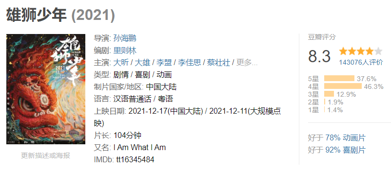 而如今《誤殺2》的票房已經超7億,《雄獅少年》僅為1.4億。
