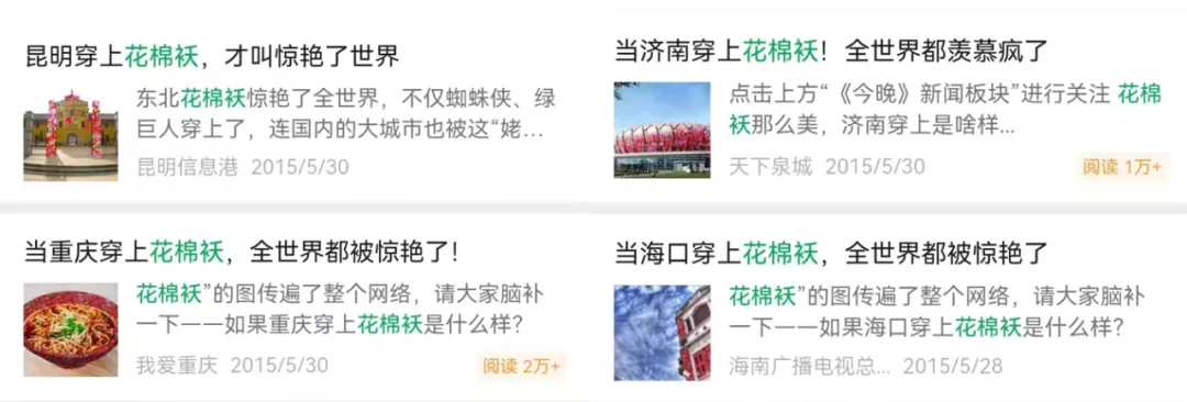 首先,東北大花布的“土氣”基因滿足了網友戲謔玩梗的狂歡需求。“聽説你們城裏人都喜歡這麼玩”“東北大花布是檢驗顏值的唯一標準”“爆款,你們敢不敢買”“如果我變成這樣,你還會愛我嗎”……諸如此類的花布梗火爆全網,成為人們調侃自嘲的優質話題。這更類似於當下流行的“土味文化”,是一種底層粗狂生命力的體現,是以感官為主的獵奇審美。