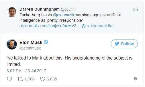 馬斯克顯然不高興,發推稱:“我和扎克聊過人工智能,他對這個領域的瞭解很有限。”意思就是,説得好下次別説了,你懂什麼啊你?
