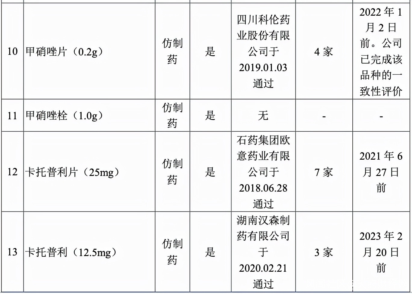 石藥集團歐意藥業有限公司在2018年6月通過了卡託普利片(25mg)的一致性評價;科倫藥業(002422.SZ)在2019年1月通過了甲硝唑片(0.2g)的一致性評價;湖南漢森製藥有限公司於2020年2月日通過了卡託普利(12.5mg)的一致性評價。