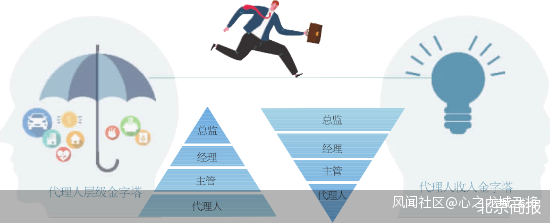 單槍匹馬不如團隊作戰。在加入保險業前,作為家庭頂樑柱的李明立下了30萬年薪的軍令狀。思慮一番後,他瞭解到,僅憑一己之力單打獨鬥很難有高收入,金字塔式的保險代理人組織層級卻可以讓他輕輕鬆鬆實現自己的小目標。