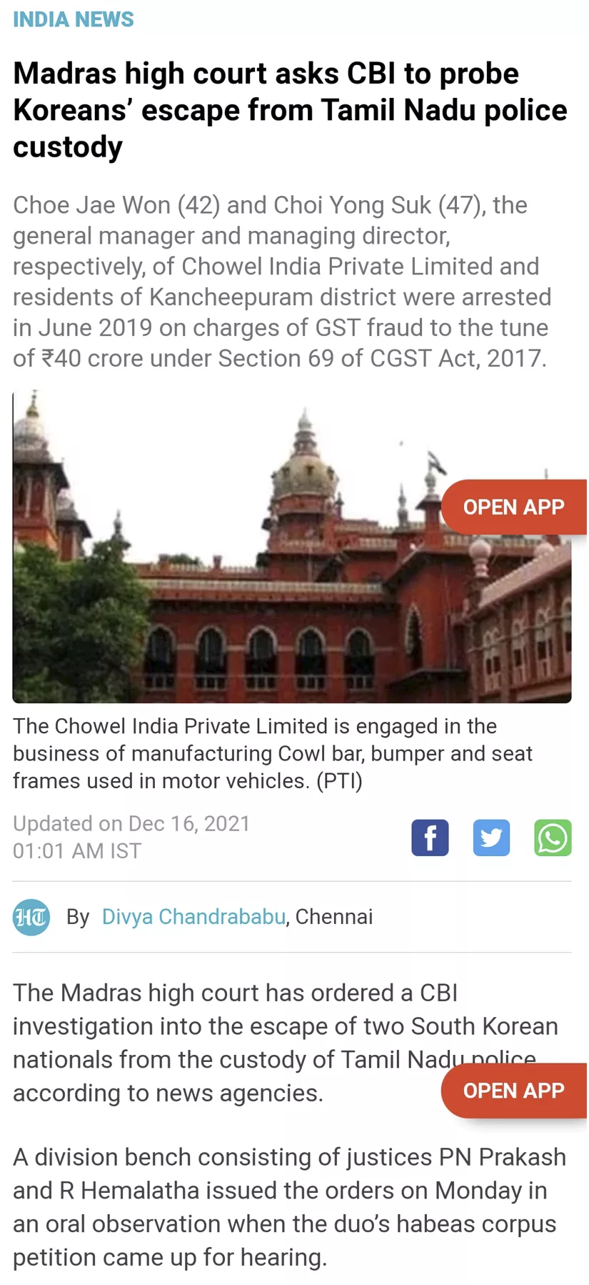 由於害怕被“一鍋端”,2021年後第二波疫情爆發時,**集中營裏有兩個韓國人以感染風險為由設法離開了這裏。**那倆人在這邊的公司涉嫌逃税4億盧比被起訴,一開始呆在監獄裏,後來被保釋到了這裏。他們當時用手機拍了很多集中營內部不符合防疫規定的情況——比如看守不戴口罩、不遵守社交距離、衞生狀況差之類——然後把照片發給了律師,讓律師向高院提出申請,説裏面的環境和防控措施無法保障他當事人的生命安全,要求高院釋放他們回家——那段時期印度很多監獄看守所都把部分犯人放回家了,但集中營卻沒有這類政策。後來高院對申請作出了回應:允許他們回到金奈家中,但不許邁出家門一步,並且他們每個月得支付30萬盧比用於一對一看守他們的警察(警察需要三班倒)。聽説那倆韓國人回到家裏過得還不如集中營裏頭自由,真是偷雞不成蝕把米。顯然不能指望電子腳鐐這麼高級的東西存在於印度這種中世紀國家——在印度凡是能用人力解決的問題,決不用科技手段,否則這些人可不就失業了嘛!