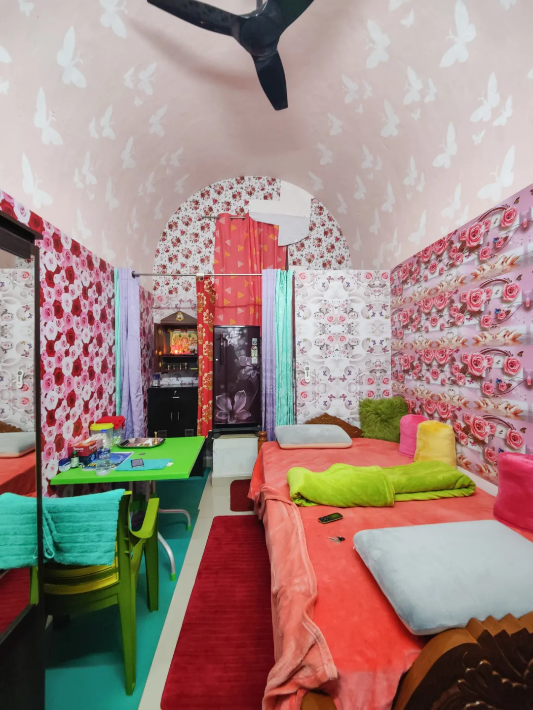 最讓我震驚的莫過於黑幫老大的牢房,**如果説皮特的牢房是“豪宅”,那黑幫老大住的絕對是“宮殿”。**他房間裏有一張1.2米寬的實木牀,是集中營裏最大的牀,牀上有硅膠枕、抓絨毯,地上鋪着地毯和墊子。要知道整個牢房才不到2.5米寬,那張牀就佔掉了將近一半的空間。剩下的空間有衣櫃有桌椅有神龕有冰箱有淋浴有音響,當然這些還不足以顯示出老大與眾不同的身份,他得意洋洋地指着牆上的遙控器,告訴我房間裏的吊扇是帶遙控的。**牢房的裝修風格洋溢着滿滿的南亞農家樂審美,**所貼的牆紙是紅色玫瑰圖案,拱頂上則用塗料畫滿了蝴蝶。牢房裏的其他各種擺設也極盡豔俗之能事,無比辣眼睛。