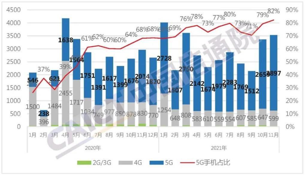 據信通院日前公佈的數據顯示,2021年1-11月,國內市場手機總體出貨量累計3.17億部,同比增長12.8%。其中,5G手機出貨量2.39億部,同比增長65.3%,佔同期手機出貨量的75.3%,並且這一比例整體呈現上升趨勢,在11月份達到了82%。