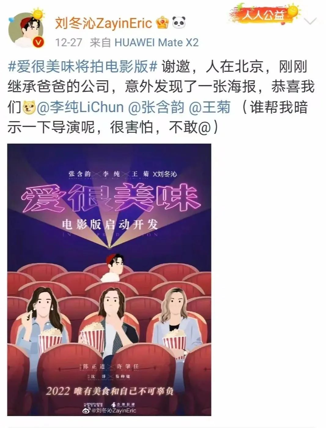 劉冬沁:《花戎》剛剛殺青,《愛很美味》也官宣了電影版,我還給自己P了張海報哈哈哈,説不定明年可以在電影院再相見。