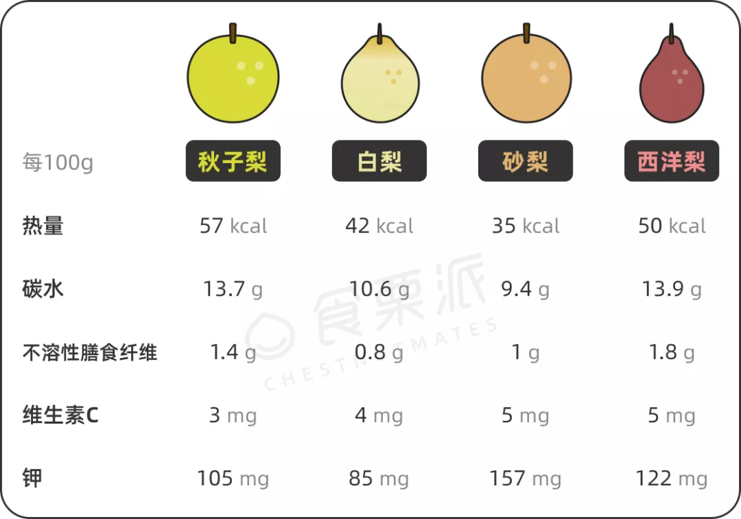 ▲ 秋子梨、白梨數據來自中國食物成分表,分別為京白梨、雪花梨這兩個品種的數據。砂梨、西洋梨數據來自台灣食品成分資料庫,砂梨數據為豐水梨,西洋梨為紅皮西洋梨,具體品種未註明