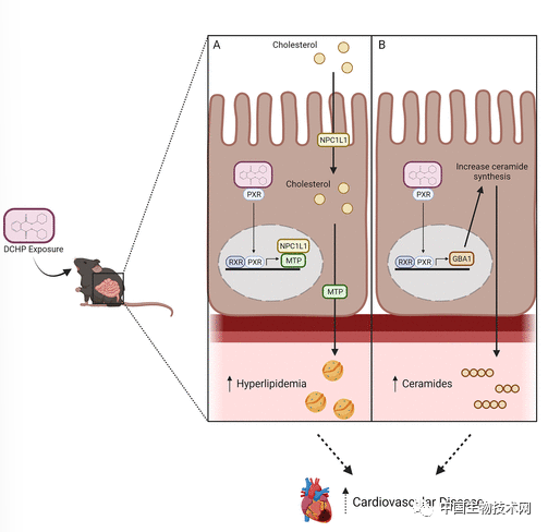 這一發現似乎是劑量和PXR依賴性的。DCHP介導的PXR激活誘導膽固醇吸收和轉運所需的關鍵蛋白質表達。實驗表明,DCHP通過靶向腸道PXR信號誘發高膽固醇。