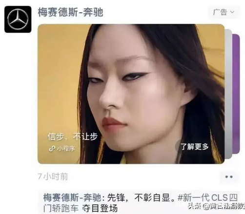 以及奔馳所請的廣告模特也是故意把自己化成了斜眼(斜眼的特點是一對眼睛的兩邊高,中間低)