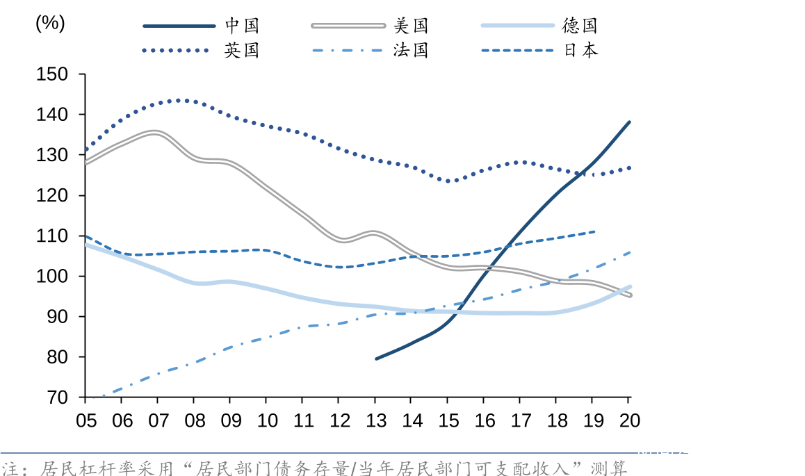 2)很多地方政府低估了中央解決地方債的決心,以及對房地產下手調控的決定,中國房地產已經連漲5年,這個週期已經很長了,如果不是2018年美國發動貿易戰搞極限施壓,2020年初發生新冠疫情,這波房地產上漲週期不會這麼長,現在中國的居民槓桿率已經處於歷史高位(見下圖),情勢也到了需要馬上處理的程度,2020年就已經有很多房產方面的強力政策出來,地方如果還是觀望而沒有把財政緊縮計劃落實並切實做好,沒有痛下決心切實做好清理債務,過苦日子的準備,就會方寸大亂。