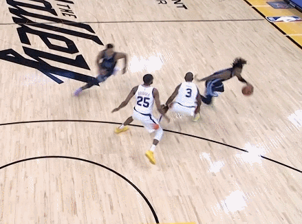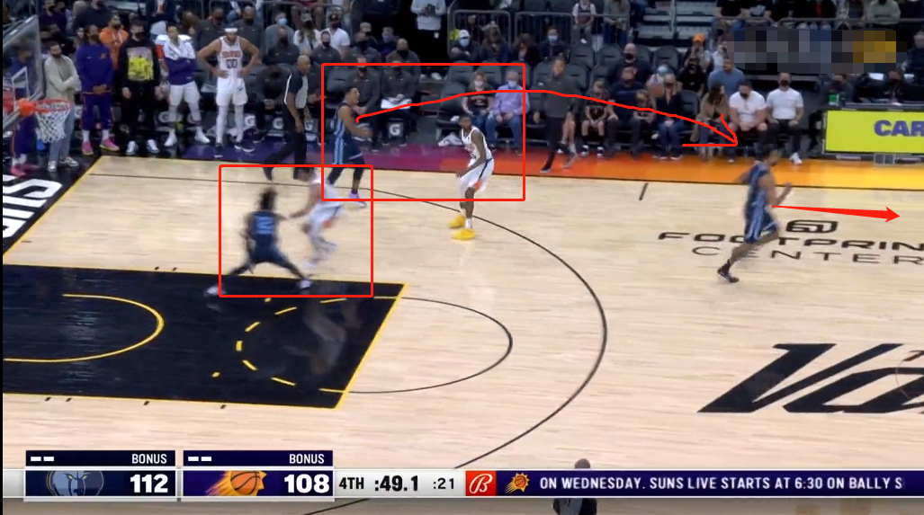 灰熊最後一個球也不復雜,莫蘭特來到上線接球,看似要和貝恩打一個二人轉,太陽換人之間猶豫了剎那,但莫蘭特太快了,就這一剎那,莫蘭特已經如同刀片一般持球到了禁區。