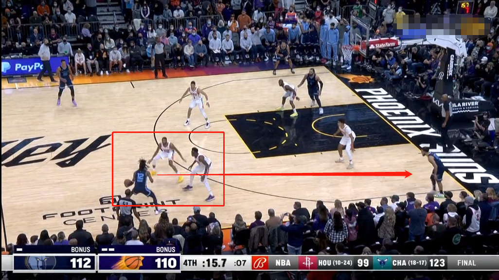 兩員大將加上主教練的缺陣,使得太陽全場被灰熊壓着打,下半場太陽開始夾擊延誤莫蘭特,同時放空他的外線投籃,進攻端開始瘋狂提速尋求每一個反擊機會。