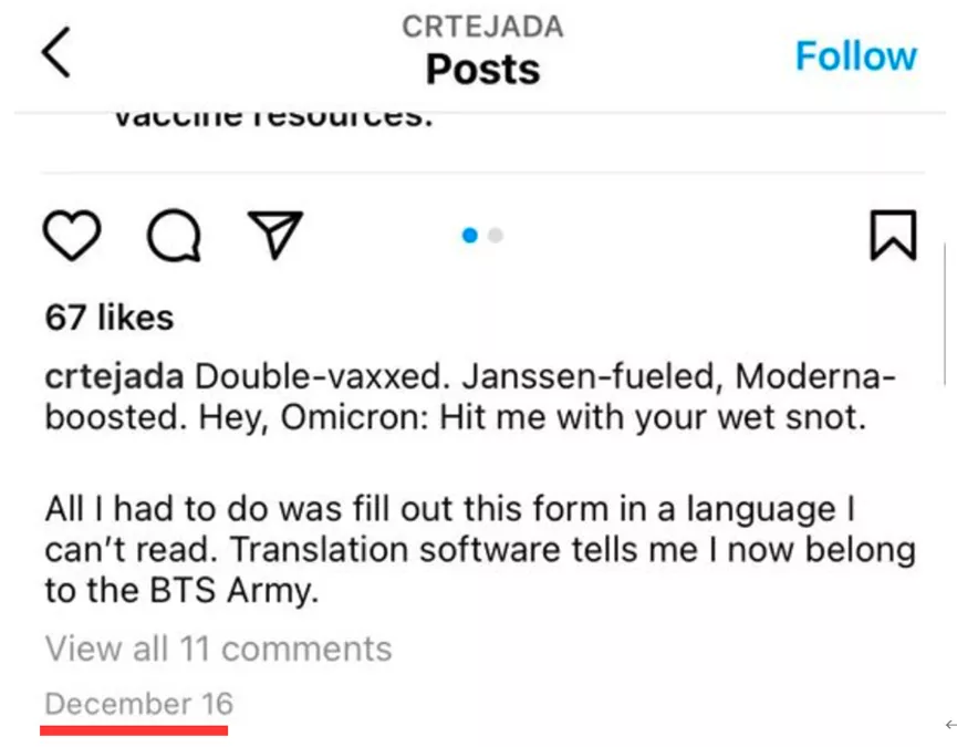 耿直哥多方核實後確認,Carlos Tejada曾在他心臟病發病逝世的當天,即2021年12月16日,在自己的Instagram社交賬號上發帖,稱自己在韓國接種了莫德納的新冠疫苗加強針。當時他在貼文中對此事表現得相當開心,並稱自己已經準備好迎戰奧密克戎變種毒株(如下圖所示)。
