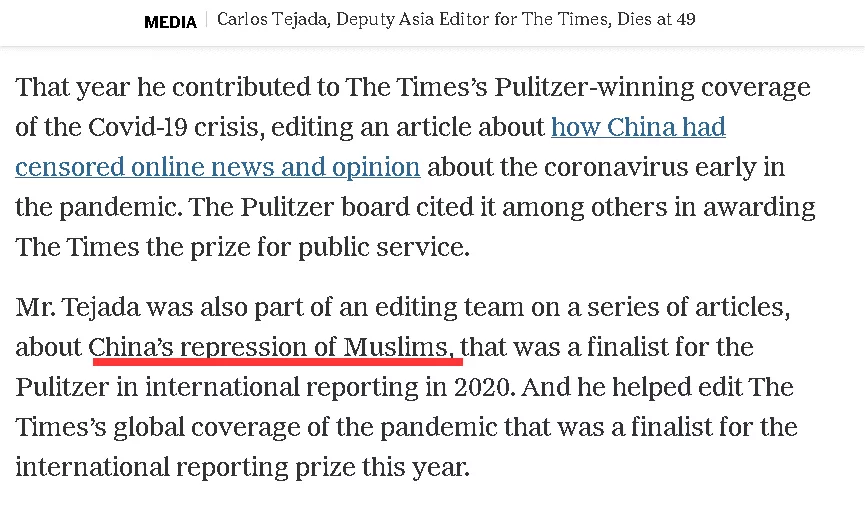 這名中國事務編輯名叫Carlos Tejada,今年49歲。《紐約時報》在12月22日報道了他的死訊,並在文章中羅列了他的一些“成就”。但這些成就卻大多是建立在對中國的抹黑上,比如中國如何“鎮壓”新疆的穆斯林,以及中國如何“刻意隱瞞”新冠疫情的嚴重性——他甚至還因這篇報道獲得了美國的“普利策新聞獎”。