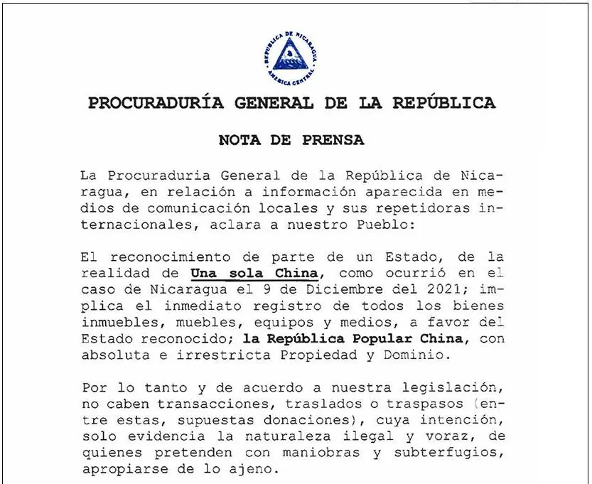尼加拉瓜政府日前宣佈,將根據“一箇中國原則”沒收台灣“駐尼加拉瓜大使館原館舍”,並移交給中國政府。