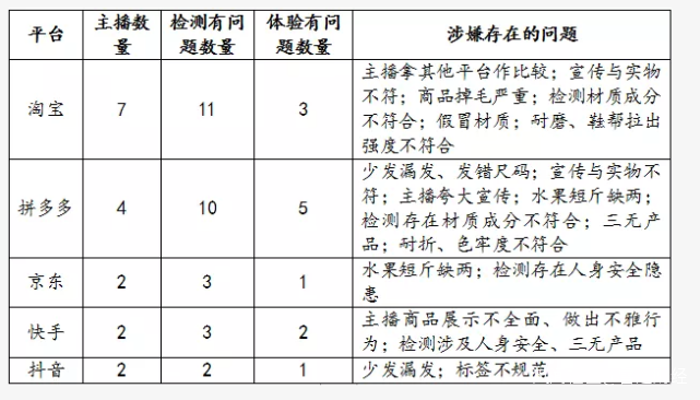 浙江省消保委體察時發現,個別主播存在誇大宣傳、用絕對性廣告語、拿其他平台做比較、少發漏發、發錯尺碼、宣傳與實物不一致等。在購買的80個批次樣品中,29個批次樣品不符合國家標準,不符合率為36.25%。其中,三無產品10個,商品質量不符合國家標準9個(存在人身安全隱患4個),材質成分不符合國家標準7個(假冒材質1個),標籤不規範3個。