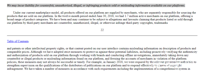 雷達財經注意到,拼多多在2018年7月24日公佈的上市招股書風險因素中曾提及,公司可能會對平台上銷售的假冒、未經授權、非法或侵權產品或誤導性信息,承擔責任。
