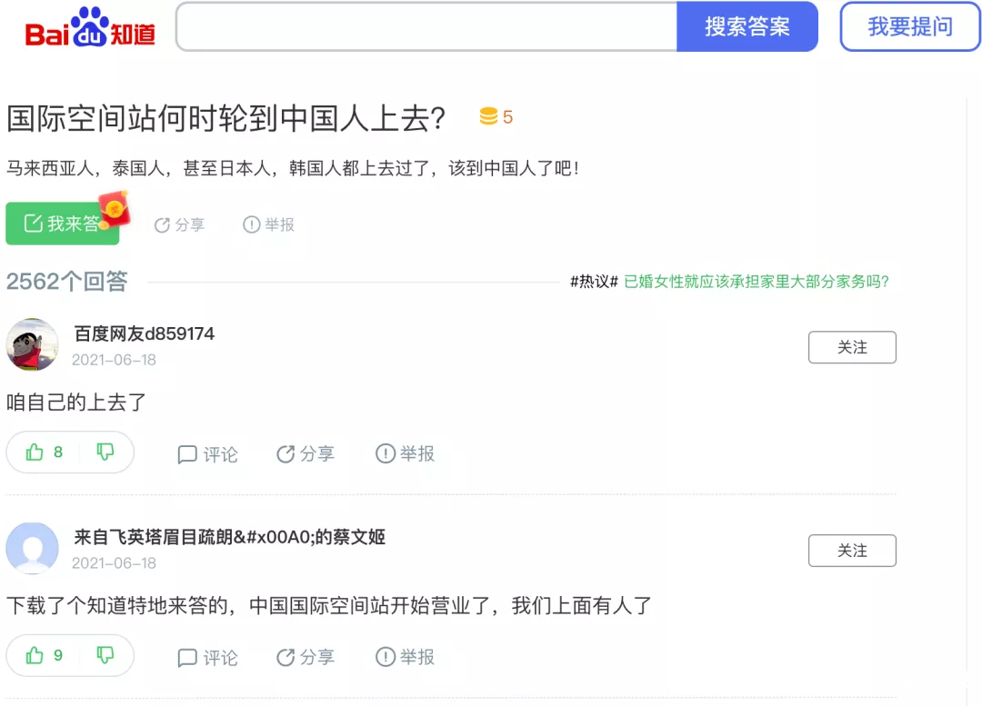 我在前文提到百度知道熱門問題「國際空間站何時輪到中國人上去?」。