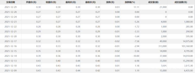 12月29日,陽光100中國股價一改連陰多日的頹勢,在港股恒生指數單日下跌1.08%的情況下,盤中一度逆勢漲11.11%至0.3港元,但東方財富Choice數據顯示,推動這次大漲的成交額僅有6295港元(約合人民幣5145元)。